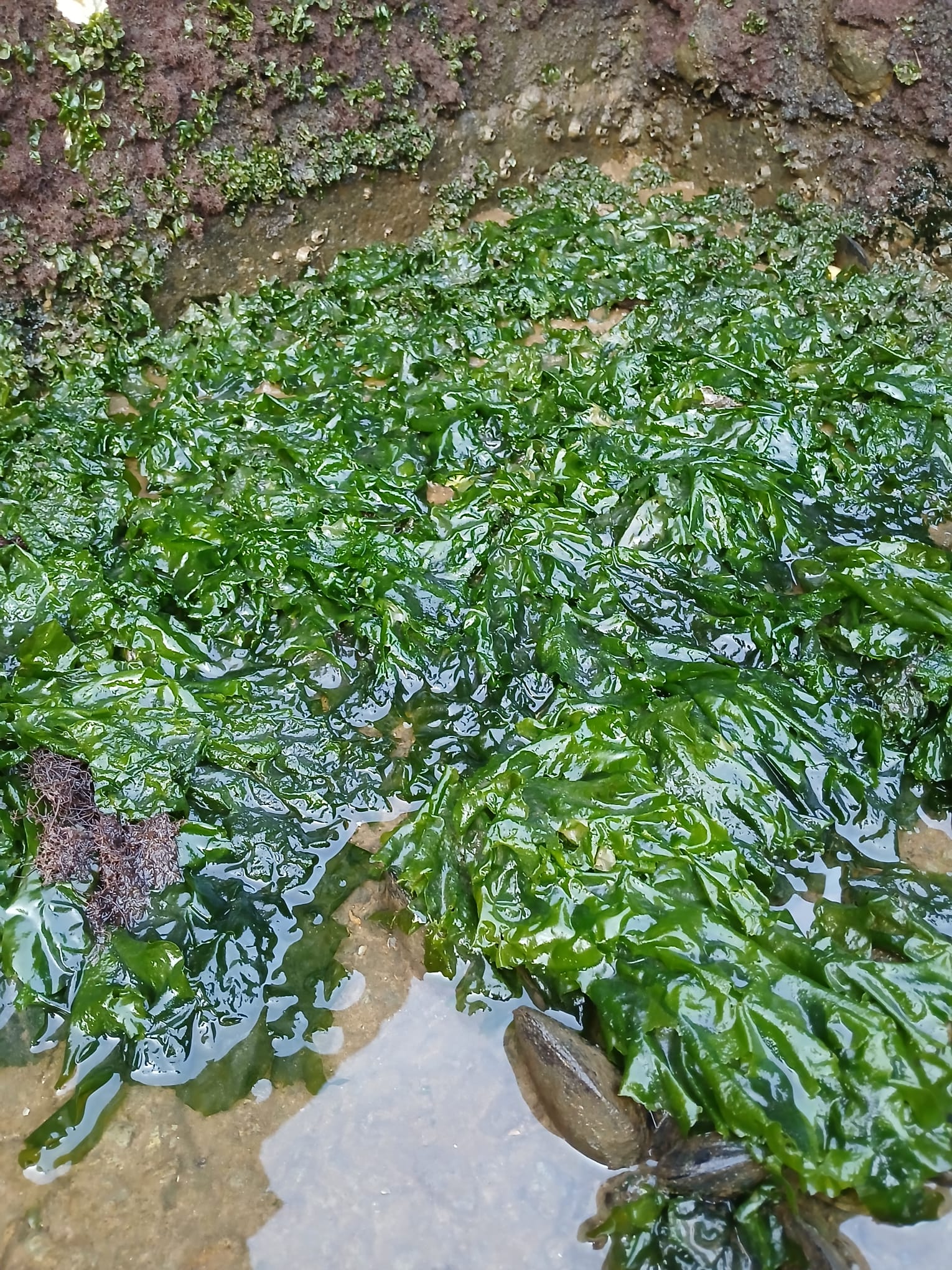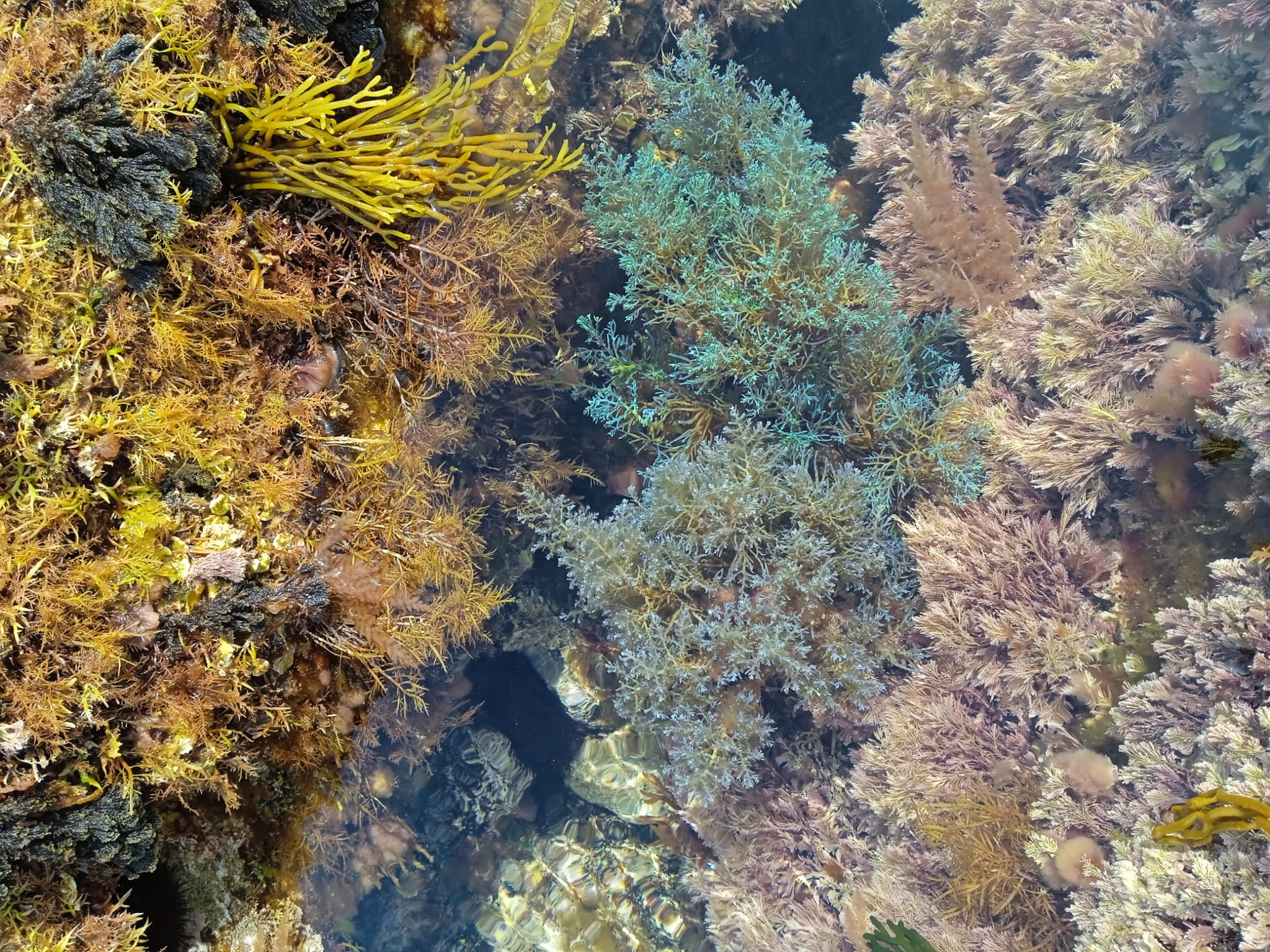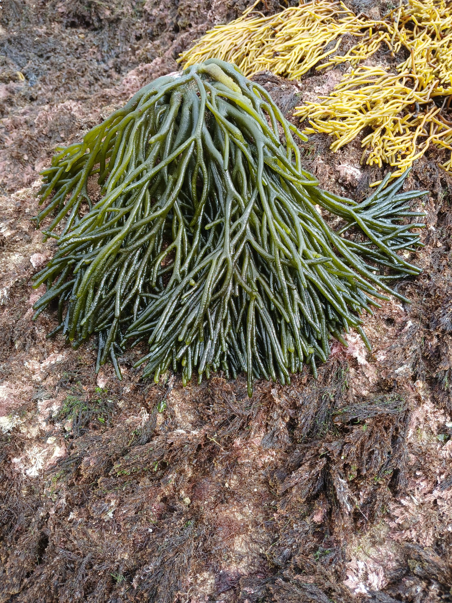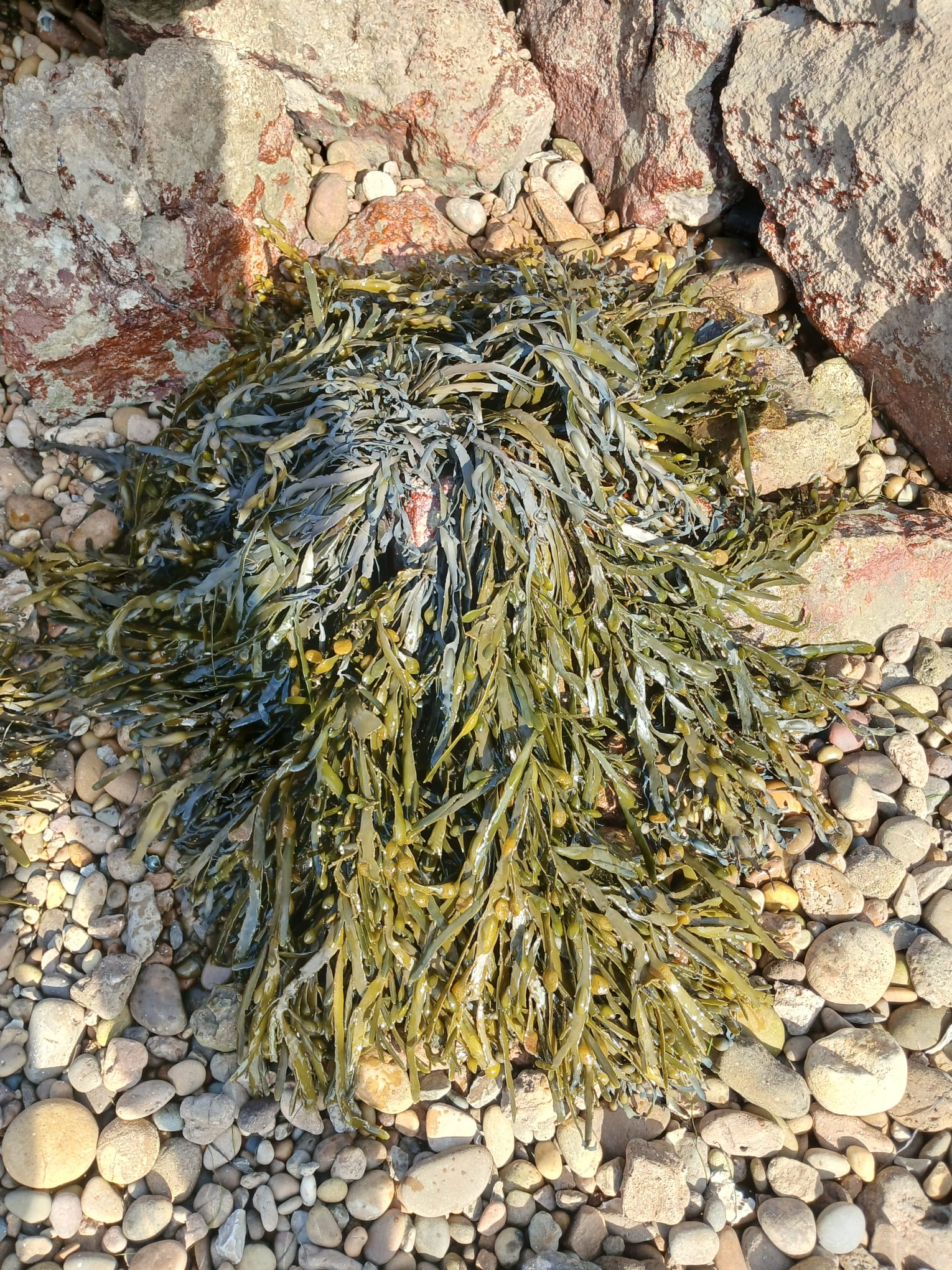 Ascophyllum nodosum, is a perennial brown algae. It reproduces between winter and spring. It is found in the lower mid-coastline in rocky areas.